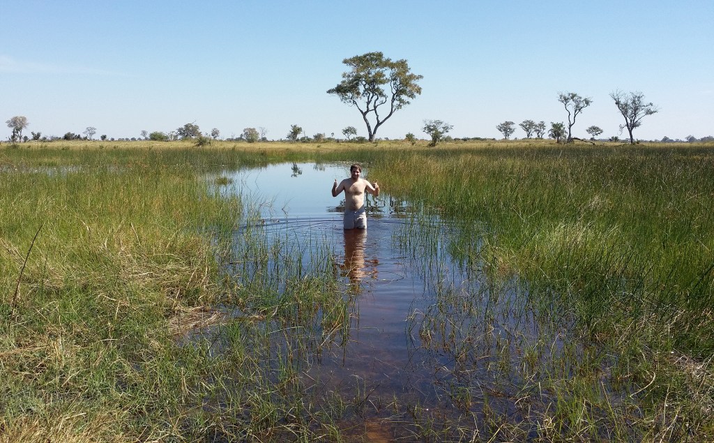 We made our way into Botswana, and to the Okavango Delta. I was able to soar over the delta in a small airplane. We cruised around the delta in a mekoro, and I went swimming. We camped on a small island in the delta. Another group joined us there. It was fun meeting new people.